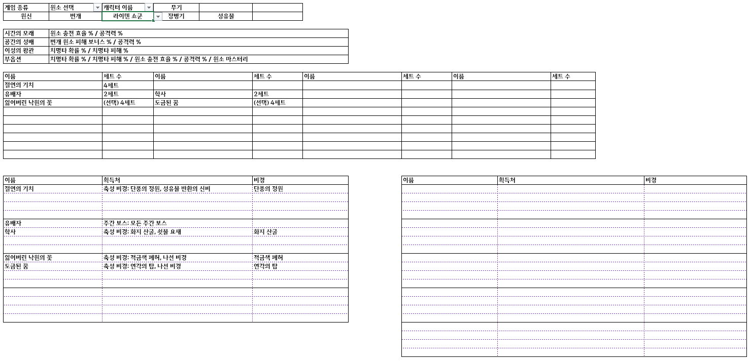 | [원신] 성유물 세팅 엑셀로 쉽게 보기 (4.5 업데이트 기준, 치오리 포함) (59) | 2024.03.20 |