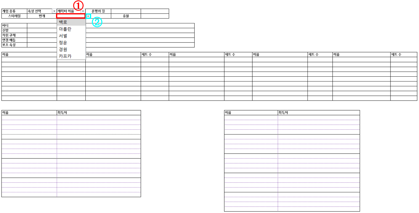캐릭터의 유물, 차원 장신구 세팅은 엑셀 내 저장되어 있으며, 조회를 통해서 쉽게 보실 수 있습니다!