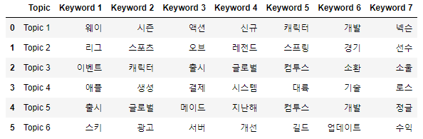 저는 각 토픽마다 7개의 키워드를 추출해서 데이터 프레임을 새로 만들었습니다!