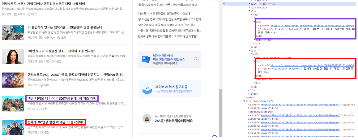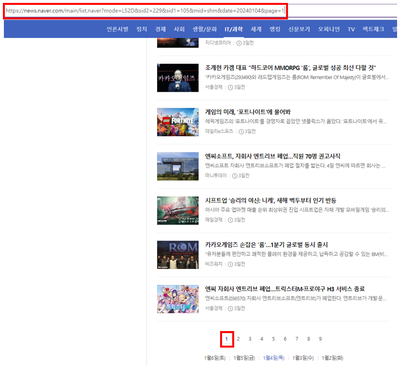 위의 그림처럼 2024년 1월 4일의 게임/리뷰 카테고리의 뉴스를 크롤링하고자 한다면 원하는 정보가 담긴 링크는