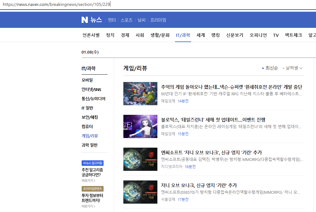 위의 그림처럼 2025년 01월 07일의 게임/리뷰 카테고리의 뉴스를 크롤링하고자 한다면, 원하는 정보가 담긴 링크는 아래와 같습니다.