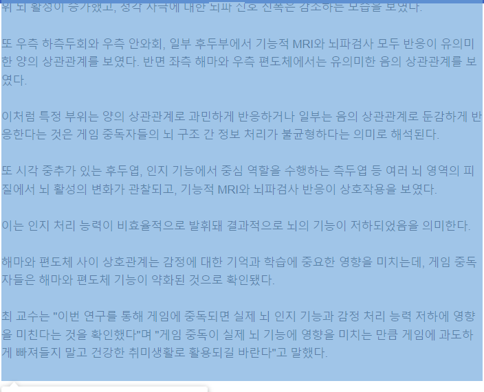 <div id="newsct_article" class="newsct_article _article_body"> <article id="dic_area" class="go_trans _article_content" style="-webkit-tap-highlight-color: rgba(0,0,0,0)"> 인터넷 게임에 중독되면 실제로 뇌 인지 기능과 감정 처리 능력이 떨어진다는 연구 결과가 나왔다.<br><br><span class="end_photo_org"><div class="nbd_im_w _LAZY_LOADING_WRAP "> <div class="nbd_a _LAZY_LOADING_ERROR_HIDE" id="img_a1"> <img id="img1" class="_LAZY_LOADING" src="https://imgnews.pstatic.net/image/031/2024/01/04/0000802219_001_20240104215001106.jpg?type=w647"> </div> </div><em class="img_desc">서울의 한 <span data-type="ore" data-lang="en">PC</span>방 [사진=뉴시스]</em></span><br><br>4일 삼성서울병원에 따르면 이 병원의 최정석 정신건강의학과 교수팀은 18∼39세 인터넷 게임 중독 치료를 받은 적 있는 환자 26명과 정상 대조군 25명을 대상으로 기능적 자기공명영상(<span data-type="ore" data-lang="en">MRI</span>)과 사건 관련 전위 뇌파 검사 등을 통해 게임 중독이 뇌 기능에 미치는 영향을 확인했다.<br><br>여기서 인터넷 게임 중독 환자는 하루에 4시간 이상, 1주일에 30시간 이상 게임을 하는 사람을 말한다. 정상 대조군은 하루 2시간 미만으로 게임 시간을 조절할 줄 아는 사람들로 구성했다.<br><br>검사 결과 게임 중독 환자들은 정상 대조군들에 비해 기능적 <span data-type="ore" data-lang="en">MRI</span> 검사에서 전두엽과 두정엽 부위 뇌 활성이 증가했고, 청각 자극에 대한 뇌파 신호 진폭은 감소하는 모습을 보였다.<br><br>또 우측 하측두회와 우측 안와회, 일부 후두부에서 기능적 <span data-type="ore" data-lang="en">MRI</span>와 뇌파검사 모두 반응이 유의미한 양의 상관관계를 보였다. 반면 좌측 해마와 우측 편도체에서는 유의미한 음의 상관관계를 보였다.<br><br>이처럼 특정 부위는 양의 상관관계로 과민하게 반응하거나 일부는 음의 상관관계로 둔감하게 반응한다는 것은 게임 중독자들의 뇌 구조 간 정보 처리가 불균형하다는 의미로 해석된다.<br><br>또 시각 중추가 있는 후두엽, 인지 기능에서 중심 역할을 수행하는 측두엽 등 여러 뇌 영역의 피질에서 뇌 활성의 변화가 관찰되고, 기능적 <span data-type="ore" data-lang="en">MRI</span>와 뇌파검사 반응이 상호작용을 보였다.<br><br>이는 인지 처리 능력이 비효율적으로 발휘돼 결과적으로 뇌의 기능이 저하되었음을 의미한다.<br><br>해마와 편도체 사이 상호관계는 감정에 대한 기억과 학습에 중요한 영향을 미치는데, 게임 중독자들은 해마와 편도체 기능이 약화된 것으로 확인됐다.<br><br>최 교수는 "이번 연구를 통해 게임에 중독되면 실제 뇌 인지 기능과 감정 처리 능력 저하에 영향을 미친다는 것을 확인했다"며 "게임 중독이 실제 뇌 기능에 영향을 미치는 만큼 게임에 과도하게 빠져들지 말고 건강한 취미생활로 활용되길 바란다"고 말했다.<br><br> </article> </div>