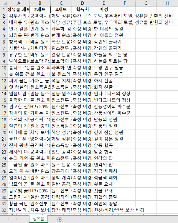 해당 데이터를 활용하여 원신 캐릭터의 성유물을 엑셀에서 쉽게 조회하는 포스팅은 아래에서 확인해주세요!
