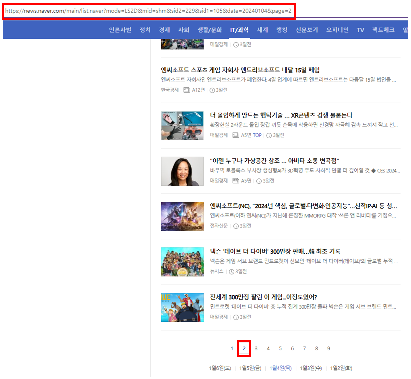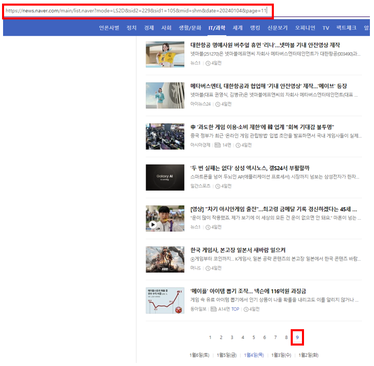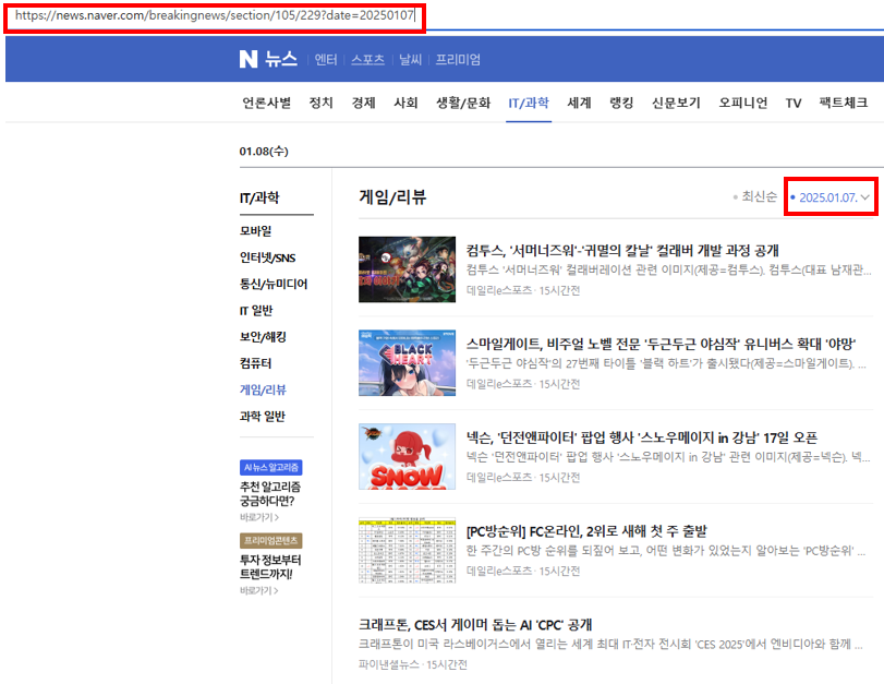 위의 그림처럼 2025년 01월 07일의 게임/리뷰 카테고리의 뉴스를 크롤링하고자 한다면, 원하는 정보가 담긴 링크는 아래와 같습니다.