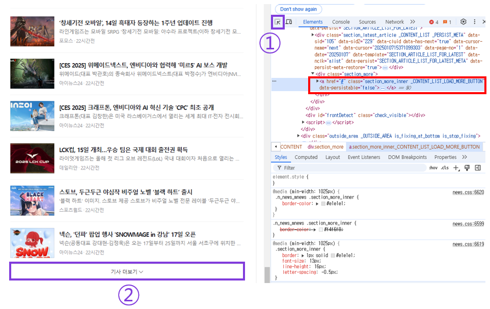 이제 개발자 도구 창을 열어, 기사 더보기 버튼이 어떤 HTML 구조를 가지고 있는지 확인하는 작업이 필요합니다.