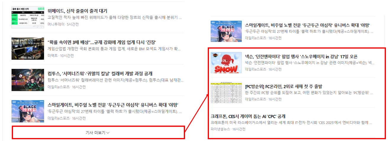 아래 그림처럼 기사를 기사 더보기 버튼을 지속적으로 클릭하다보면, 더 이상 해당 버튼이 등장하지 않는 것을 보실 수 있습니다.