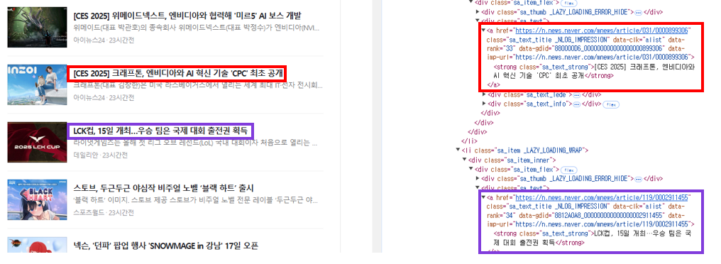 버튼을 확인했던 것처럼 개발자 도구에서 기사의 제목과 링크가 어떤 HTML 구조를 가지고 있는지 확인해보겠습니다.